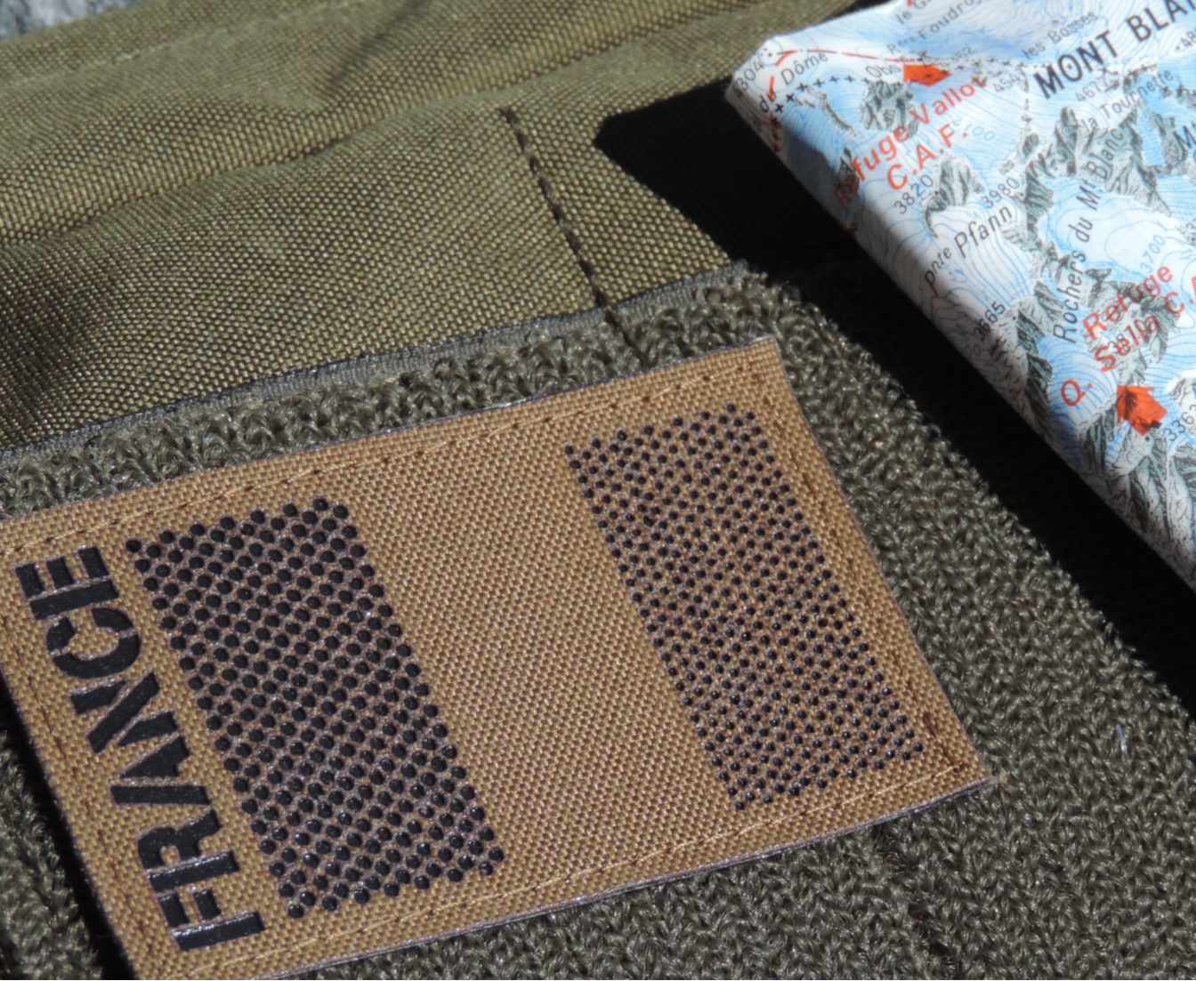 - Tissus: Cordura 500 Deniers* découpé au laser; coloris Olive ou Coyote.