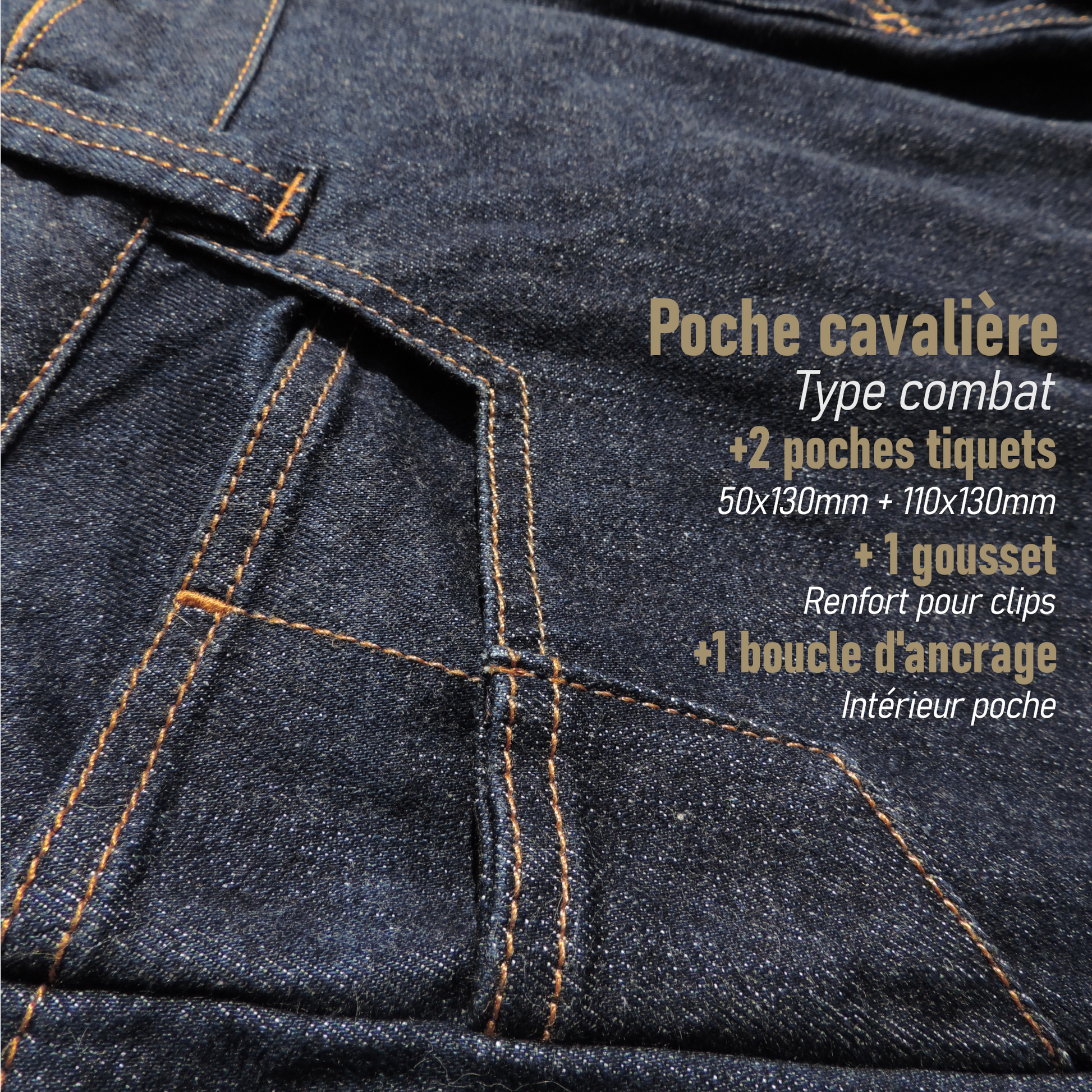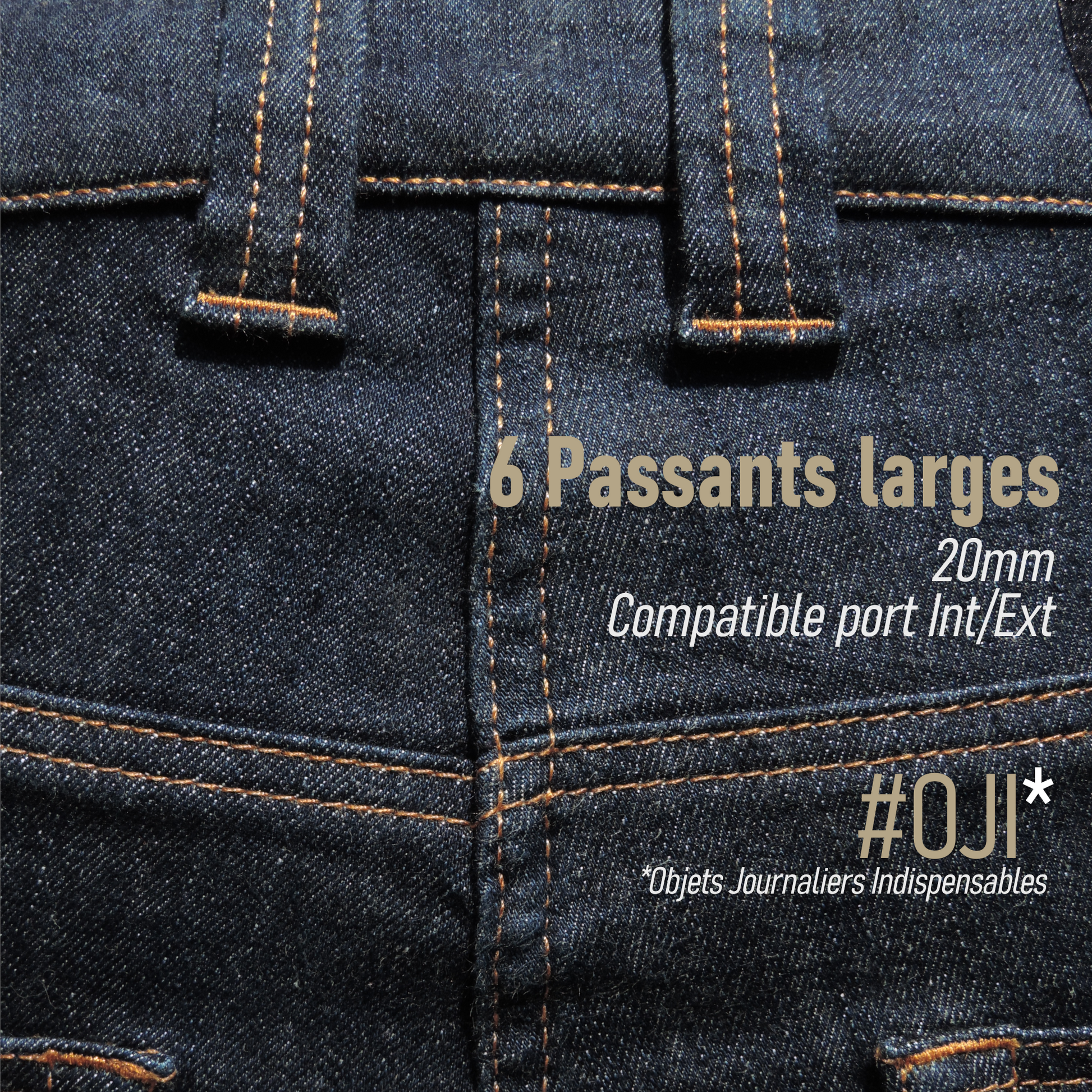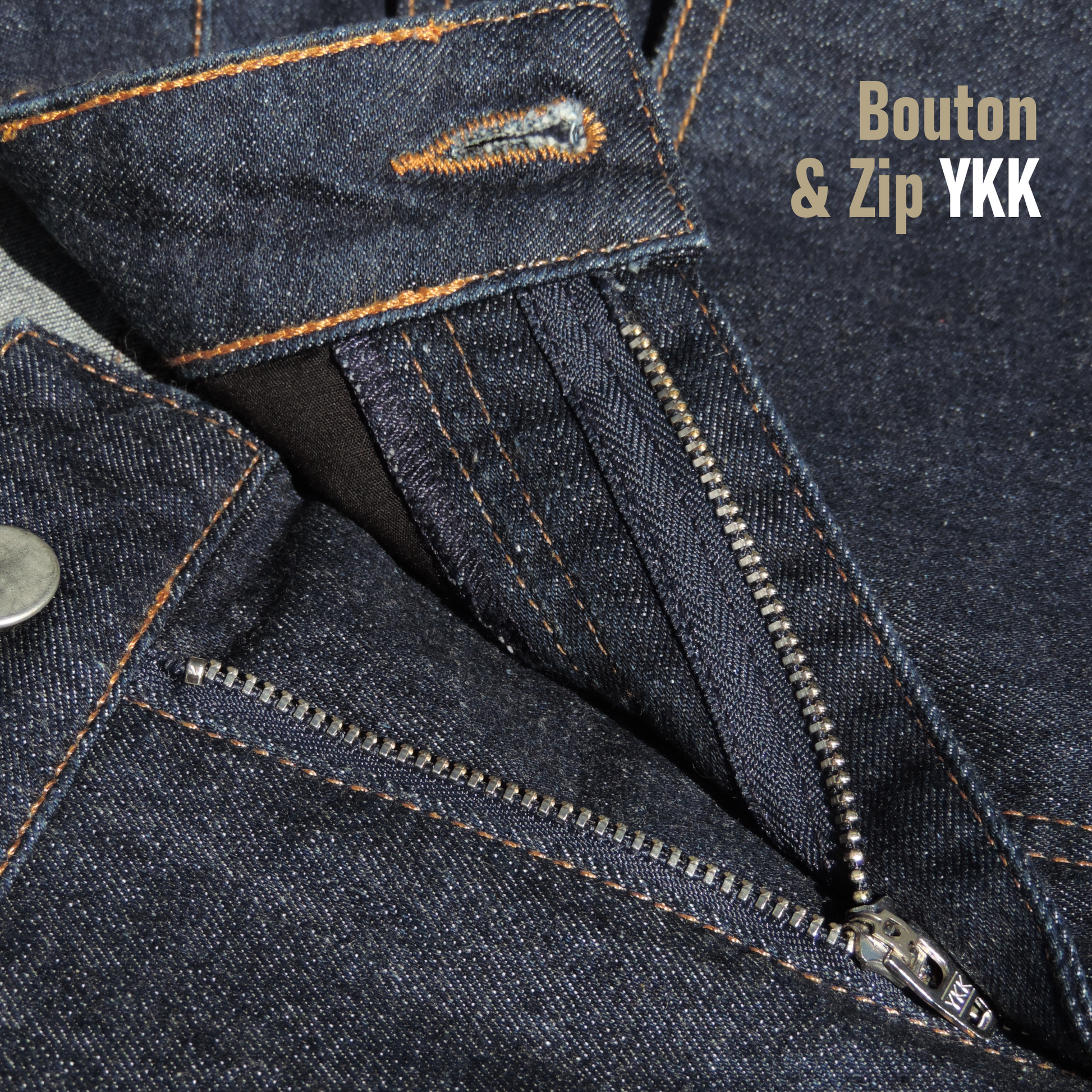 Construction: Fermeture par bouton Ă riveter et Zip YKK Auto lock. Points d'arrĂȘts / Bartaks pour remplacer les rivets en mĂ©tal. SurpiqĂ»res Ă double aiguilles. 6 passants de ceinture larges (20mm).