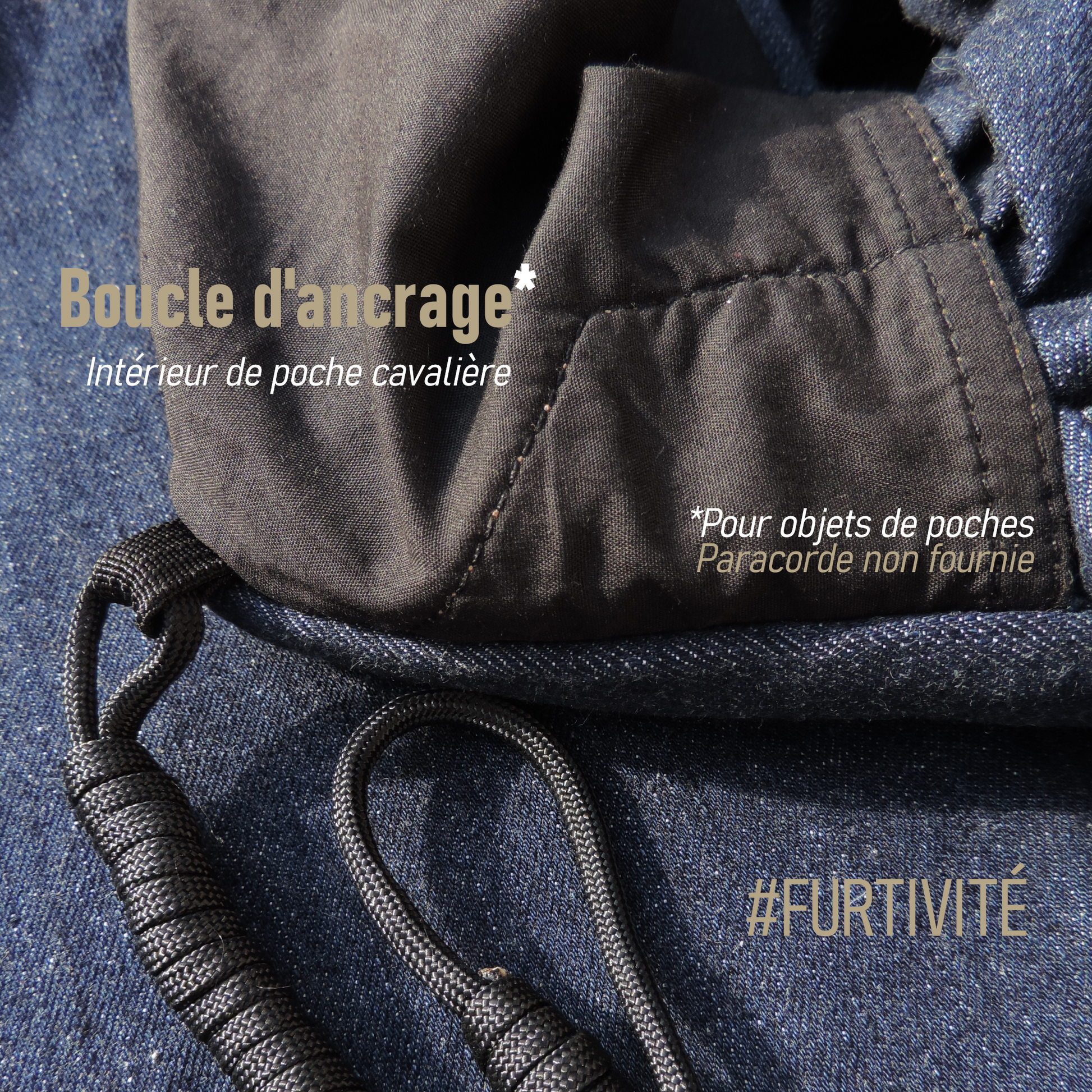 Furtivité: 2 boucles d'ancrages permettant de fixer des systÚmes de rétention à l'intérieur des poches cavaliÚres. Des jambes droites permettant aux bas de pantalons d'accueillir des dispositifs de chevilles (holsters/kit médic/OJI...).